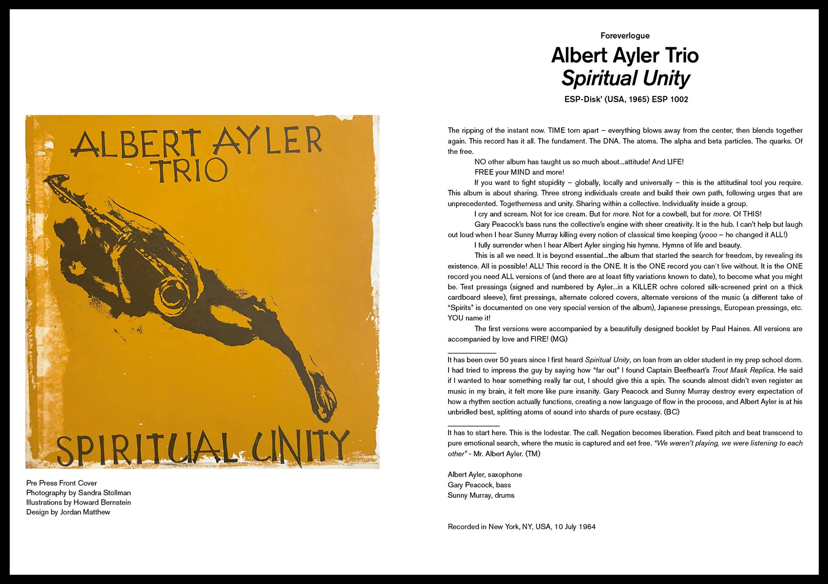 We had agreed, early on, that Albert Ayler’s Spiritual Unity was untouchable as a template for what free jazz could be, but everything else was up for discussion. Once we realized there were enough potential titles to do the list several times over, we began seriously taking into account geographical distribution and how individual records fit into the development and dissemination of the music. Finally, we divvied the records up into three batches and wrote them up, with as much context as we felt like adding. The three writing voices here are distinct, but complementary. And we were all happy to actually get the motherfucker done (thanks in large part to the editorial and design work of Eva Moore at Ecstatic Peace Library).