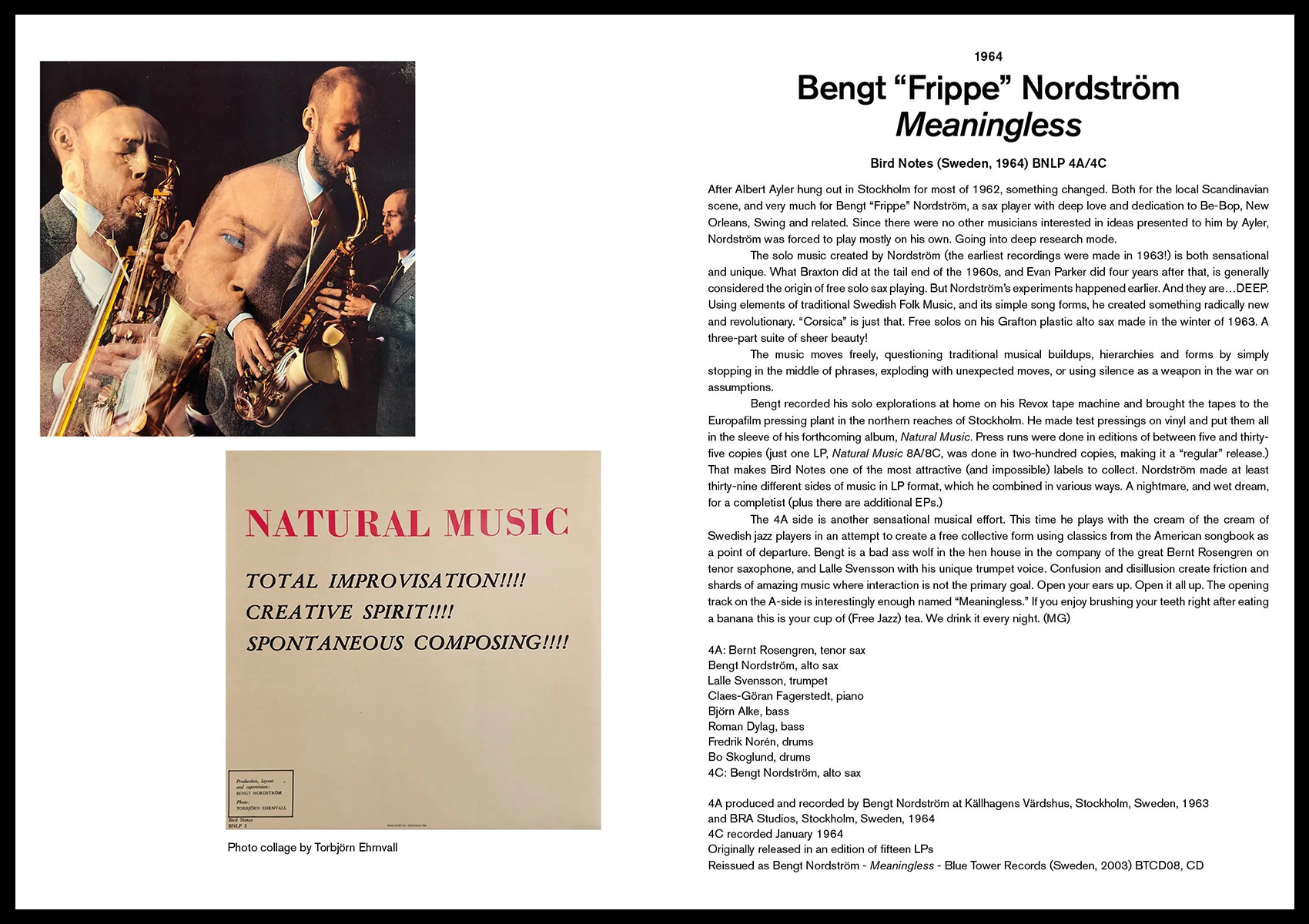 Free jazz musicians Pharoah Sanders, left, and Sonny Sharrock in Berlin, 1968, by © Philippe Gras, courtesy of Suong Gras from Now Jazz Now: 100 Essential Free Jazz and Improvisation Recordings 1960-80 (Ecstatic Peace Library).Around the same time Thurston became friends with a Swedish sax player and record maniac named Mats Gustafsson. Together with Jim O'Rourke, the three would hit record stores around the globe and literally tear them apart looking for free jazz and whatnot. They even formed a band called Diskaholics Anonymous Trio, and made an album that was only available in trade for rare jazz. Mats was totally insane for records, and had a very solid grounding of both jazz history as well as the evolution of the international avant threads. From that point onward when we would talk about “The Book,” it was always as a three-person project. And when any of us got together we'd talk about it a lot, sharing information on whatever odd gems or stores we'd happened to discover in the wild.
